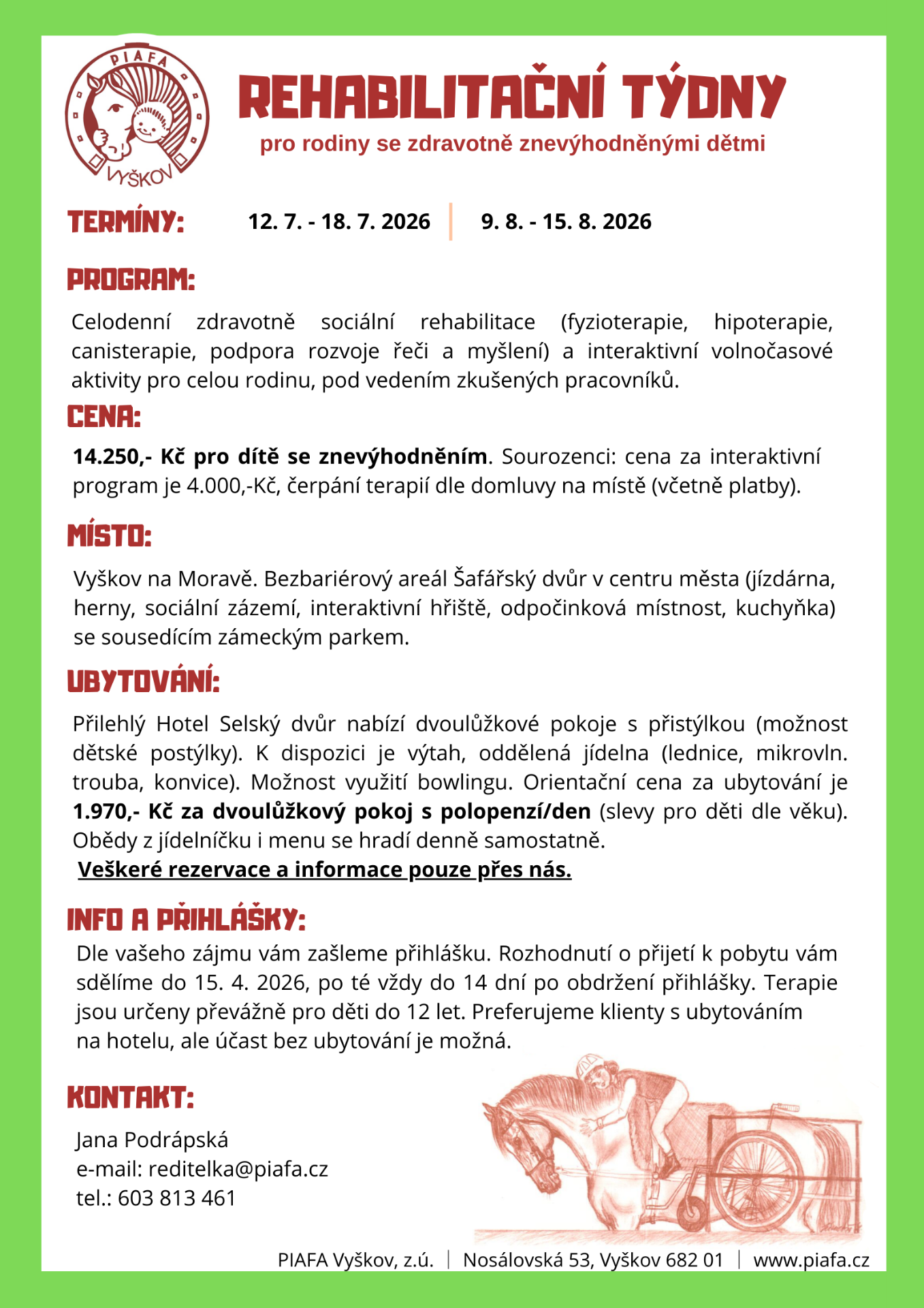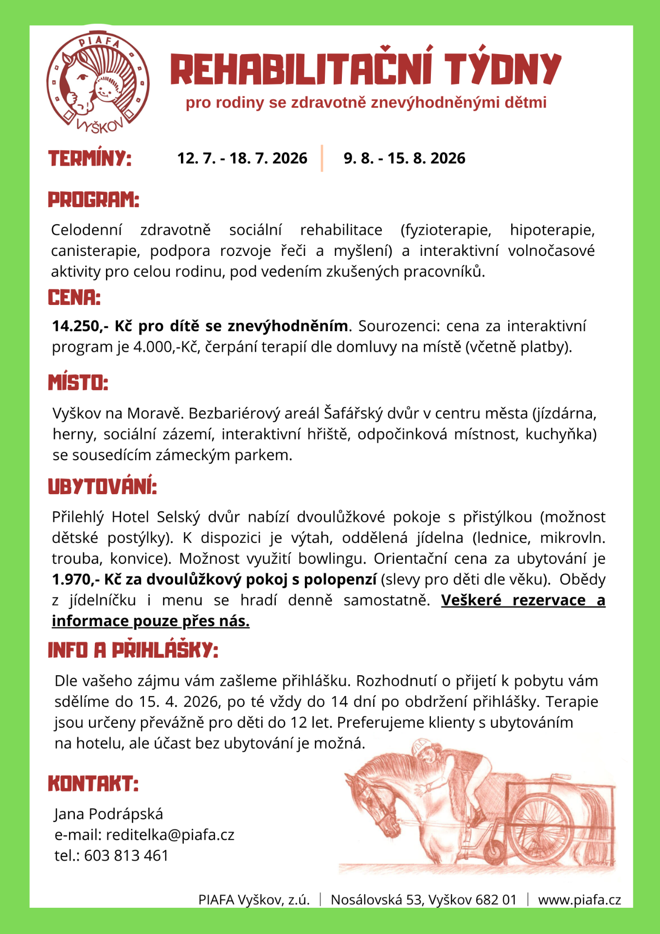 Právě jsme vypsali termíny na celodenní zdravotně-sociální rehabilitační program a interaktivní volnočasové aktivity pro celou rodinu. Čeká vás fyzioterapie, hipoterapie, canisterapie i podpora rozvoje řeči a myšlení, vše pod vedením zkušených a laskavých odborníků. První turnus začíná od 12. 8. do 18.7. 2026 a druhý pak od 9. 8 do 15. 8. 2026....