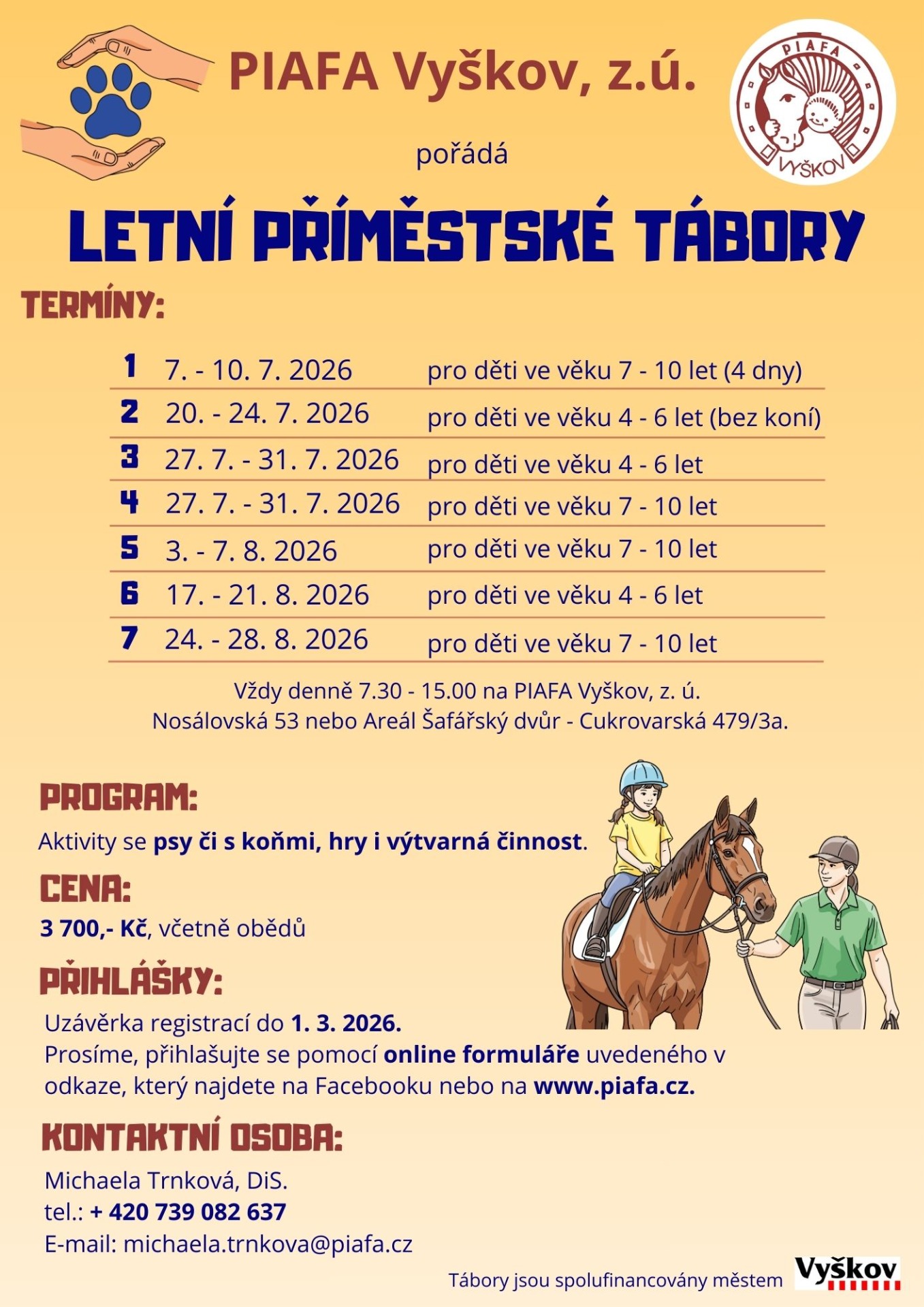 Máme vypsané turnusy příměstských táborů na letní prázdniny a už teď se na děti moc těšíme. Pokud zvažujete, kam své dítě v létě přihlásit, doporučujeme dlouho neotálet. Kapacita je omezená a jednotlivé turnusy se postupně plní.
