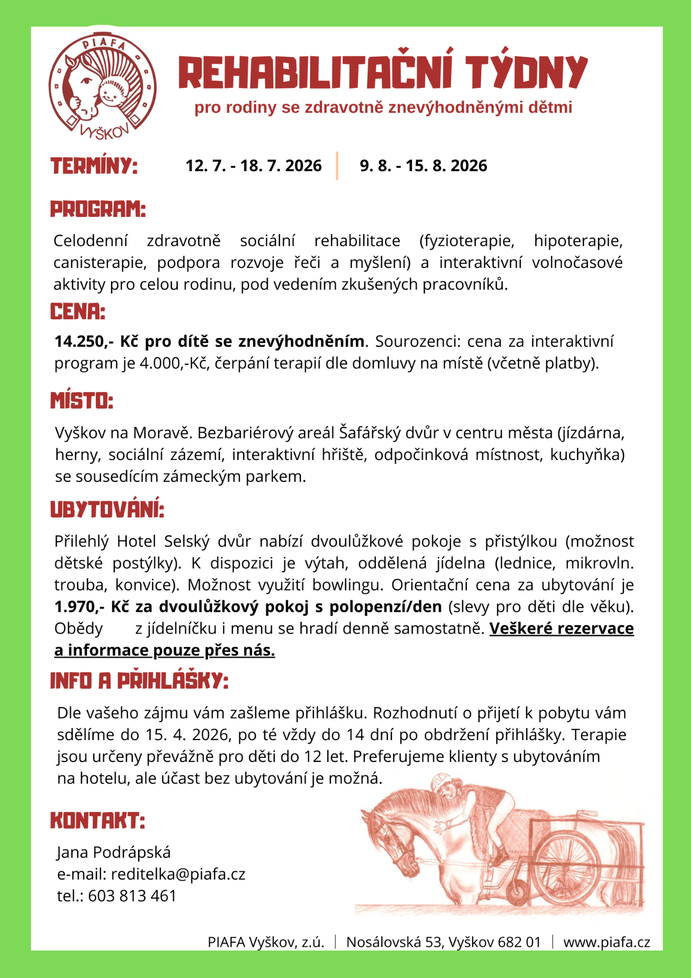Právě jsme vypsali termíny na celodenní zdravotně-sociální rehabilitační program a interaktivní volnočasové aktivity pro celou rodinu. Čeká vás fyzioterapie, hipoterapie, canisterapie i podpora rozvoje řeči a myšlení, vše pod vedením zkušených a laskavých odborníků. První turnus začíná od 12. 8. do 18.7. 2026 a druhý pak od 9. 8 do 15. 8. 2026....