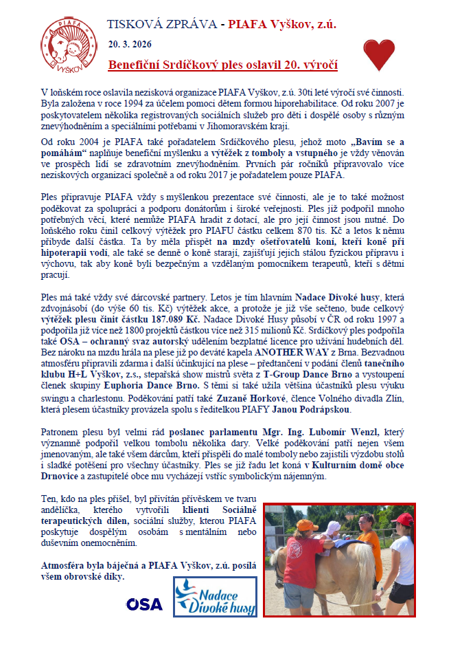 Právě jsme vypsali termíny na celodenní zdravotně-sociální rehabilitační program a interaktivní volnočasové aktivity pro celou rodinu. Čeká vás fyzioterapie, hipoterapie, canisterapie i podpora rozvoje řeči a myšlení, vše pod vedením zkušených a laskavých odborníků. První turnus začíná od 12. 8. do 18.7. 2026 a druhý pak od 9. 8 do 15. 8. 2026....