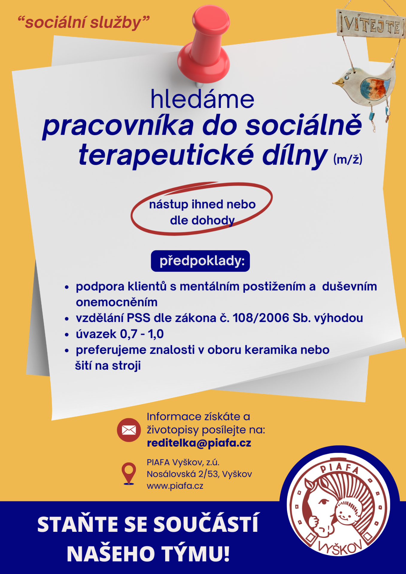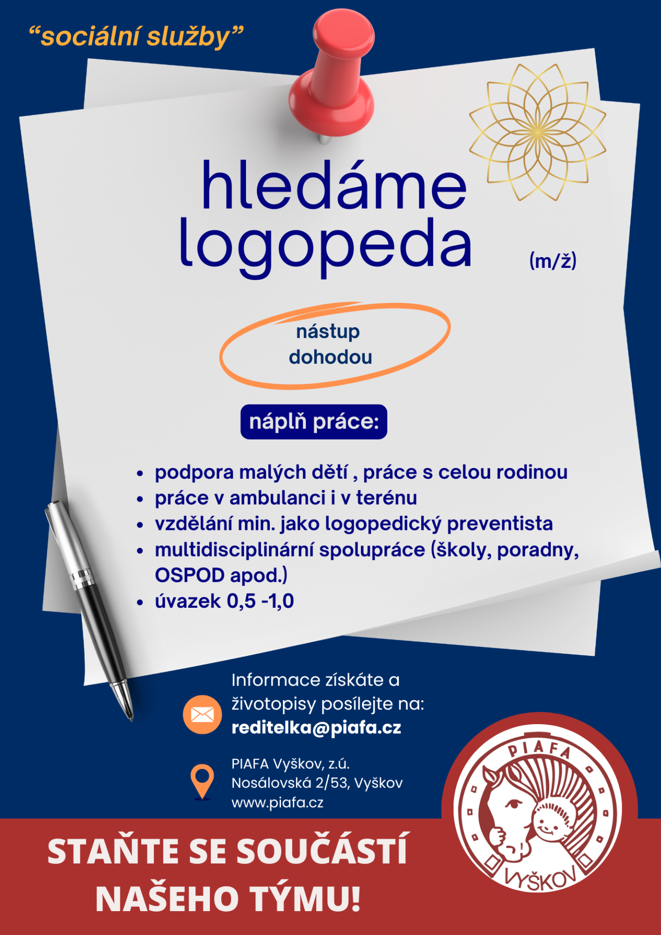 Ozvěte se nám na reditelka@piafa.cz a my se Vám v případě vypsání vhodné pozice ozveme.